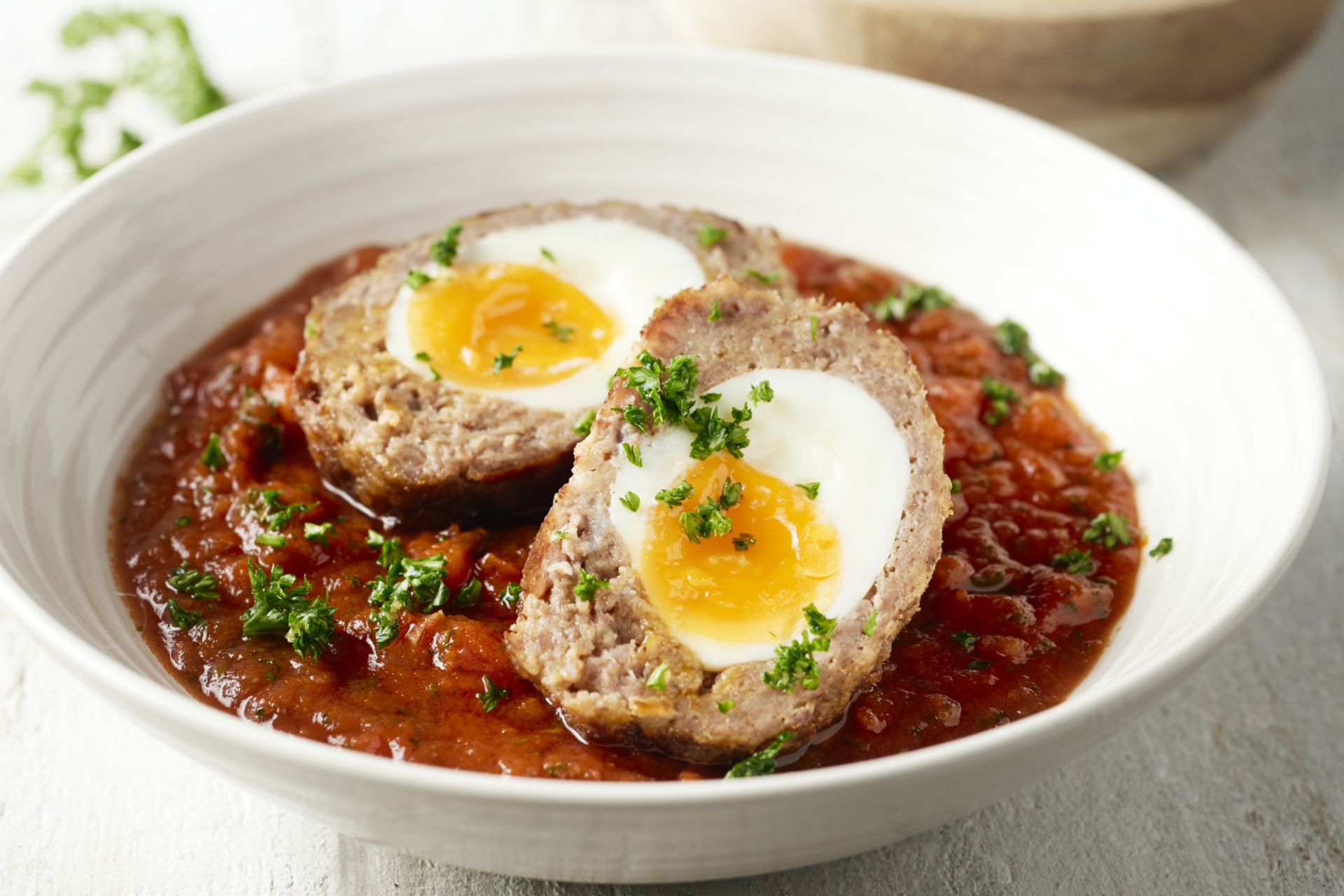 Rol 4 gelijke gehaktballen. Neem 1 gehaktbal en maak een kuiltje in het midden. Stop een hardgekookt ei in het kuiltje en verdeel het gehakt volledig rond het ei. Rol de gehaktbal tussen uw handen tot een mooi egale bal. Zorg dat het ei volledig bedekt is met gehakt en dat er geen naden of spleetjes meer zijn. Doe hetzelfde met de andere gehaktballen. Verwarm de oven voor op 180 °C.